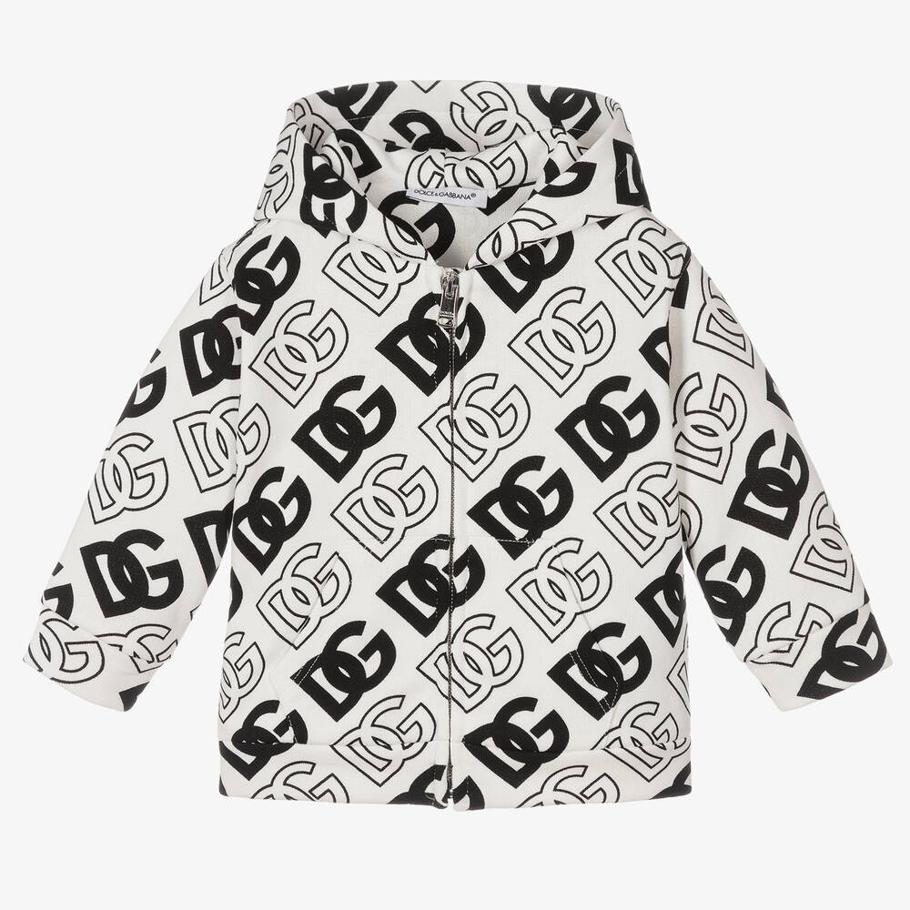 Younger boys monochrome zip-up hooded top by Dolce & Gabbana. Made in mid-weight cotton sweatshirt jersey, the white fabric has an all-over black and white DG cross-over logo print. The zip-pull has an embossed logo and there are two front pockets and ribbed cuffs and hem.