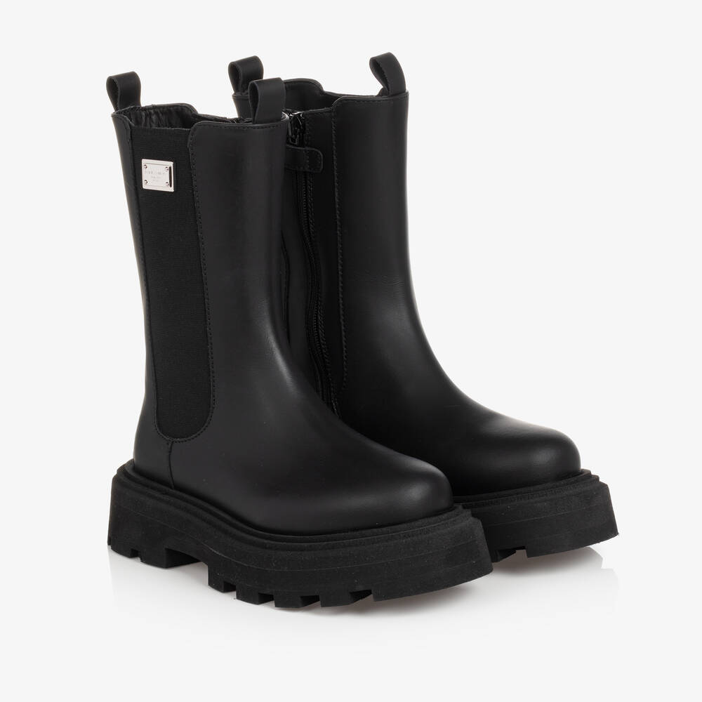 Girls black leather Chelsea boots by luxury Italian brand, Dolce & Gabbana. With a chunky rubber sole, these on-trend mid-calf length boots have a longer length shaft, with a side zip fastening and velcro tab. There are looped leather pulls on the front and back to help with dressing. They have an elasticated side gusset with a logo metal plate for a discreet designer statement.