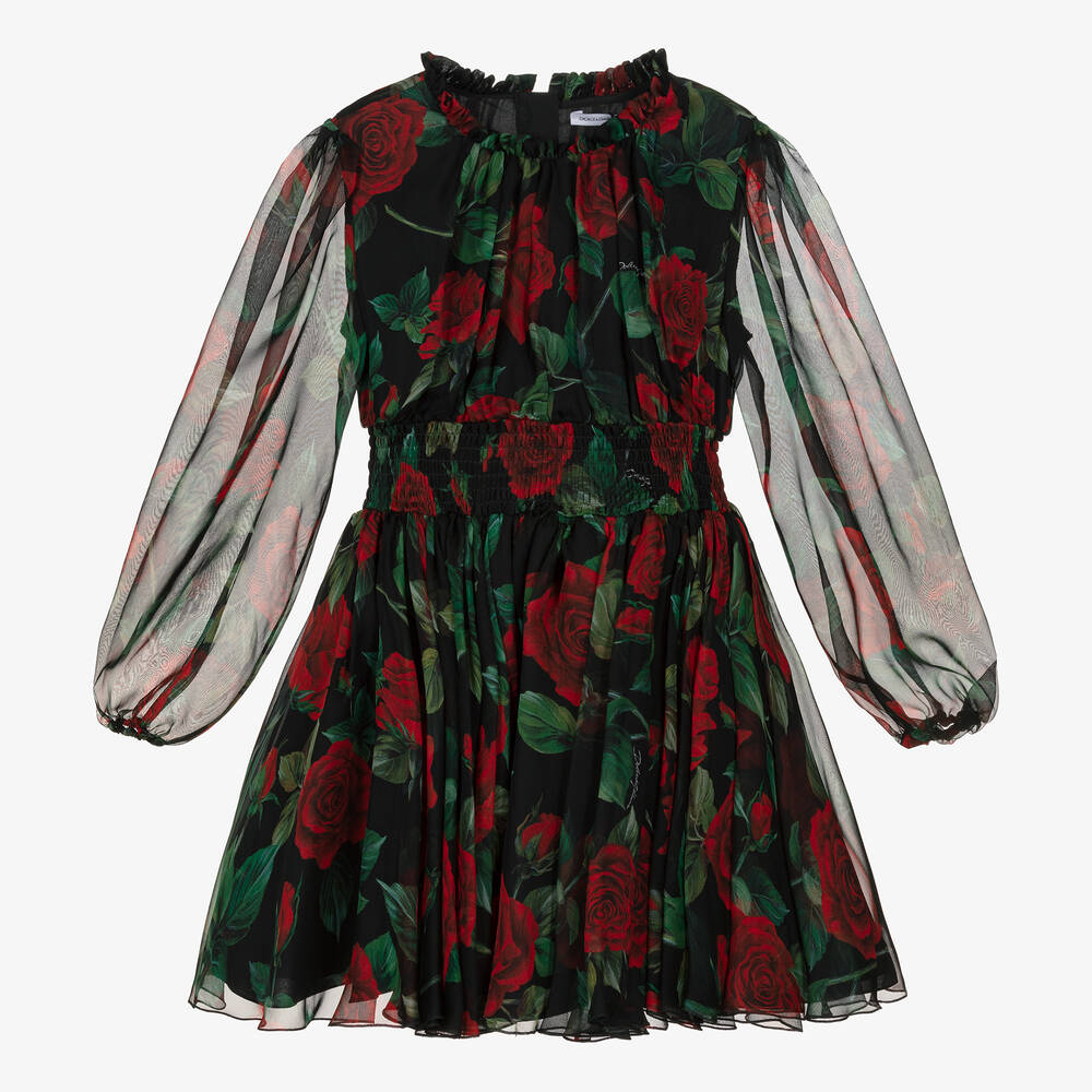 A stunning black dress for girls by Italian brand Dolce & Gabbana, in luxuriously flowy silk chiffon. It is patterned in a vivid rose design with script logos detailed throughout and has a stylish ruched waistband. The neckline is ruffled and the puff sleeves are sheer. Fastening with a concealed zip, a lightweight silk blend lining completes the design.