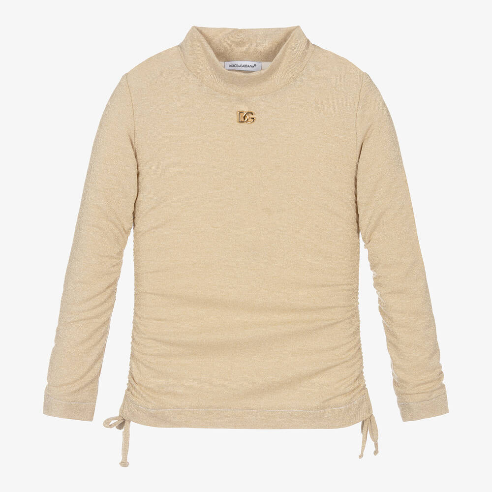Gold roll neck top for girls by luxury Italian brand Dolce & Gabbana, made in a soft viscose blend with a glittery lurex weave. Inspired by the adult collection, it is styled with a roll neck and features a metal crossover DG logo on the front in a gold tone. Fully lined in cotton jersey, this feminine top has full-length sleeves and drawstring sides to create a ruched look.