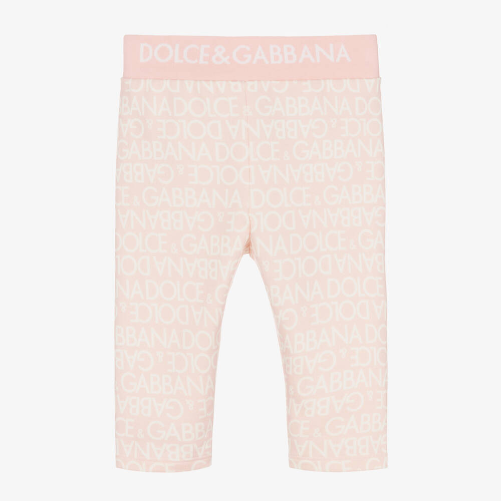 Light pink cotton leggings for little girls by luxury Italian fashion house Dolce & Gabbana. Instantly recognisable, these full length leggings are patterned with repeat white logos for distinctive style. Both practical and great for pairing, they are finished with a knitted intarsia logo on the stretchy, ribbed waistband.