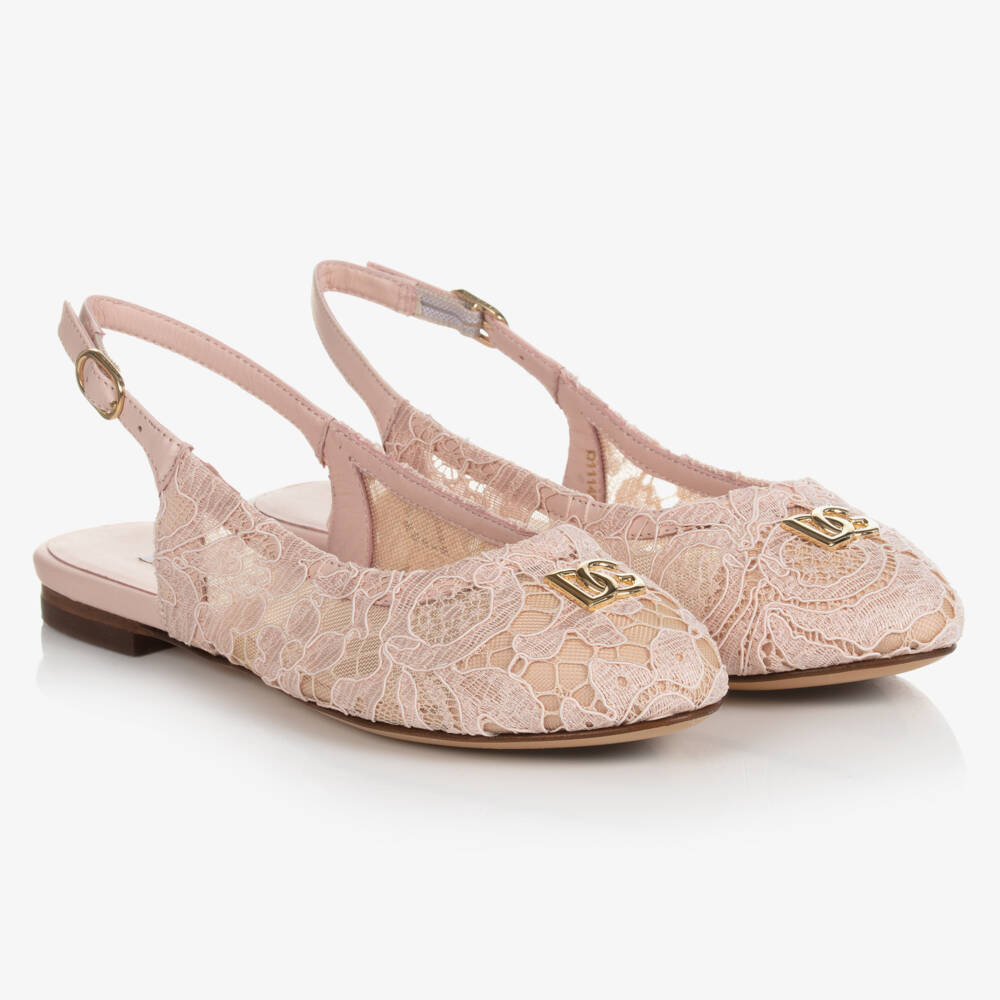 Pretty pink pumps for girls by luxury brand Dolce & Gabbana, with a gold crossover DG logo on the toe. Designed with a slingback buckle fastening, these gorgeous shoes have floral lace uppers and a lightly padded leather insole. The embossed leather sole is designed with a non-slip rubber heel and insert for added grip.