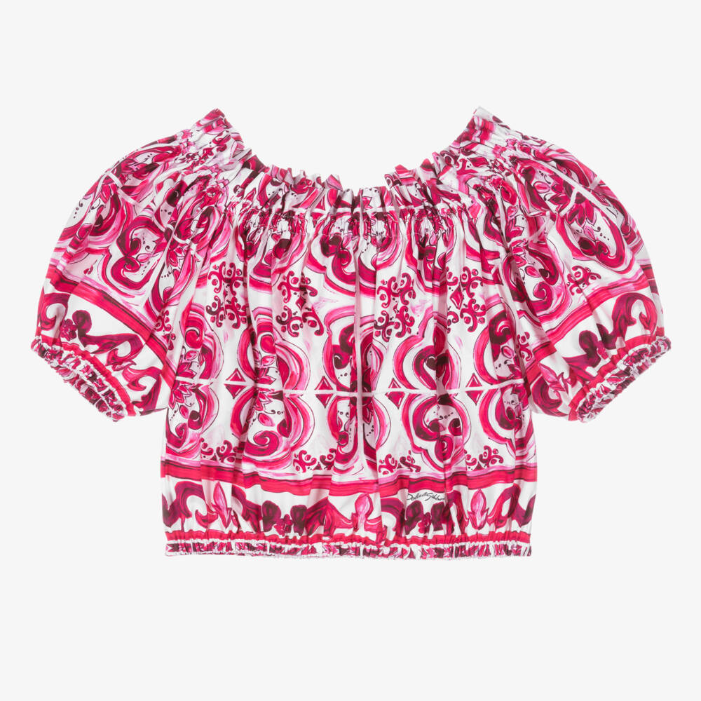 A gorgeous white blouse for girls by luxury Italian label Dolce & Gabbana, made from the softest cotton poplin. This cropped blouse is patterned in the signature fuchsia pink Majolica print for a sophisticated designer look. It is exquisitely finished with a stretchy ruched bardot neckline and elasticated puff sleeves.