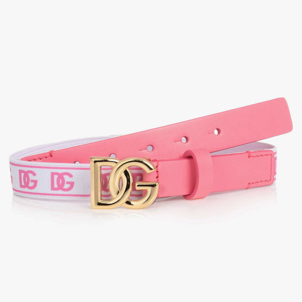 A pink and white belt for girls by Italian House Dolce & Gabbana. The front fastening is crafted in soft and supple leather with the label's luxe golden metal Crossover DG logo as a pin buckle. Stretchy for a comfortable fit, the white elastic is decorated with pink Crossover DG branding for a cool designer look.