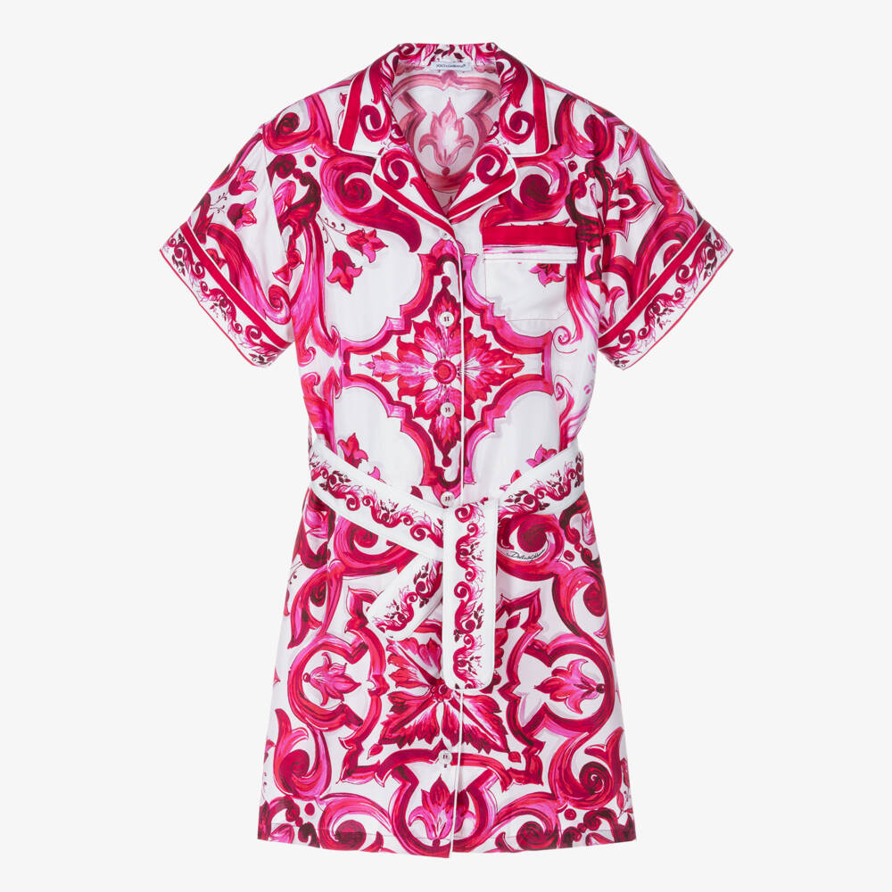 Beautiful fuchsia pink and white dress for girls by luxury Italian brand Dolce & Gabbana, made in soft silk twill. This stylish shirt dress is patterned with the designer's vibrant, Sicilian Majolica print. Soft and lightweight, it has short sleeves, white piping trims and a patch pocket on the chest. It has a stylish split hem, a removable tie belt and pearlised button fastenings on the front.