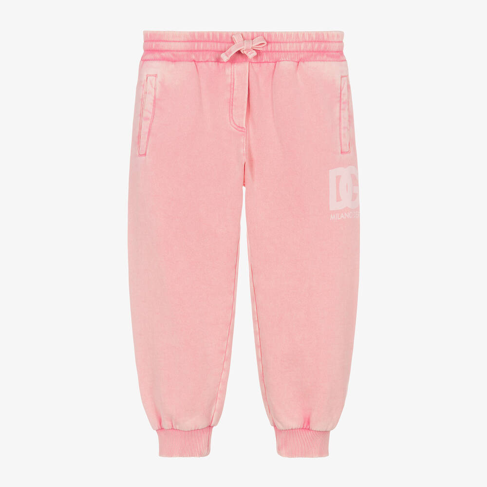 Pink joggers for girls by luxury Italian brand Dolce & Gabbana, made in mid-weight cotton jersey with an acid wash finish. Instantly recognised, these cuffed joggers have a faded crossover DG logo on the front and white logo lettering on the back of one leg. Pockets are positioned on the front and back and the drawstring waistband can be easily adjusted.