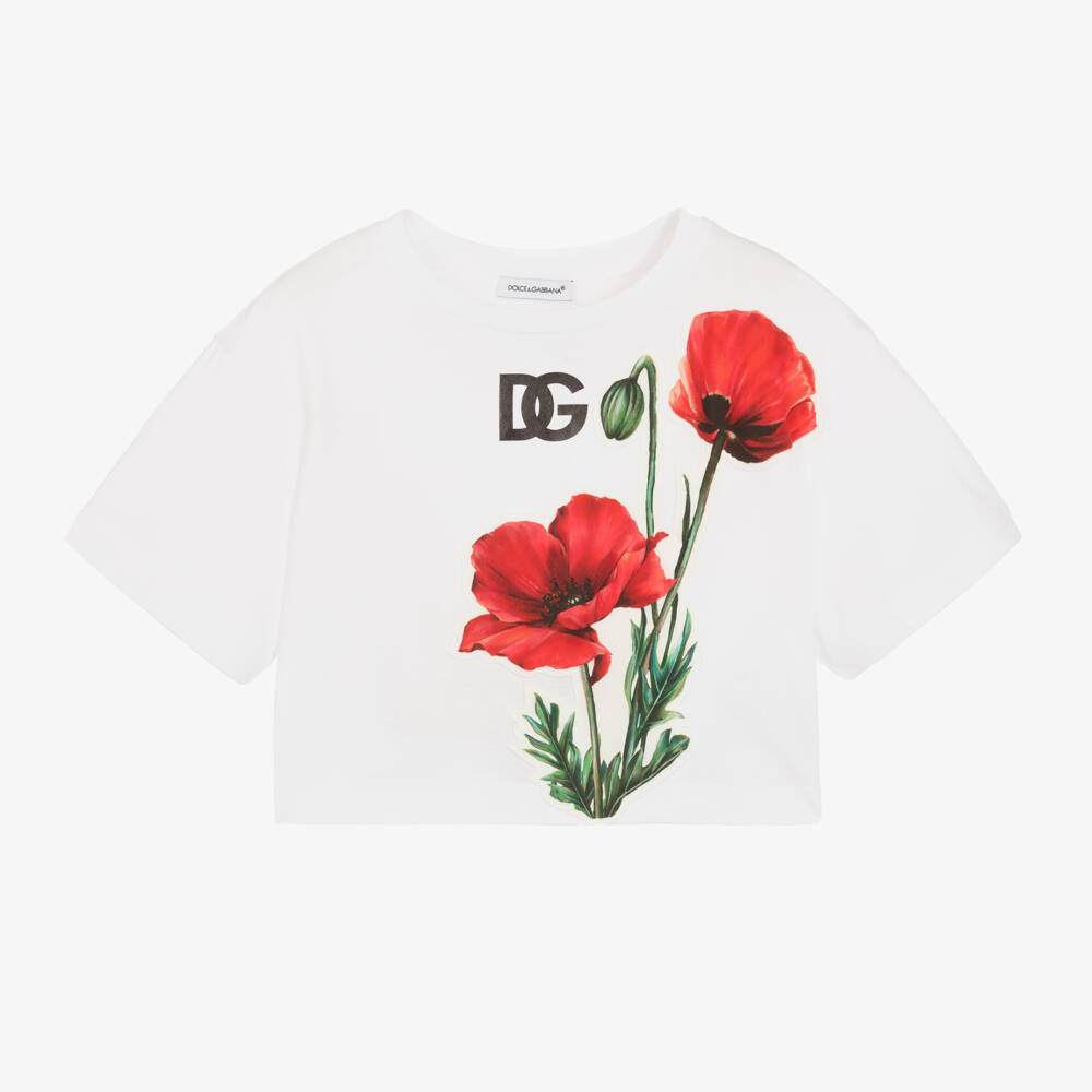 A white T-shirt for girls by Dolce & Gabbana, made in luxuriously soft cotton jersey. In a trendy cropped style, this tee features a red and green poppy pattern, for a boldly energetic look. The floral design is accompanied by the distinctive crossover DG logo print.