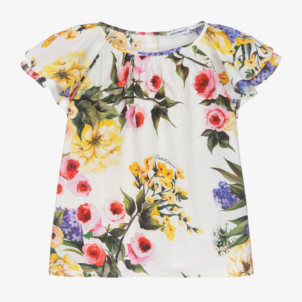 A white blouse for girls by luxury brand Dolce & Gabbana, made in soft cotton poplin. Pretty and playful, the Italian designer's signature logo is subtly signed within a colourful floral pattern for an eye-catching look. Neatly gathered at the neckline, it has fluttery short sleeves and closes on the back using pearlescent buttons.