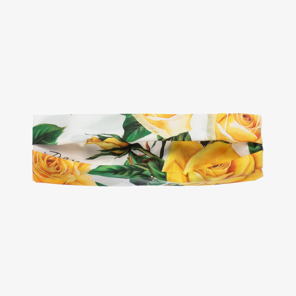 A beautiful hair accessory from Italian label Dolce & Gabbana, this headband for girls is decorated with a yellow, white and green rose pattern. Designed for comfort, this soft cotton poplin headband has a gently elasticated panel around the back. Script branding within the print adds that luxury designer touch.