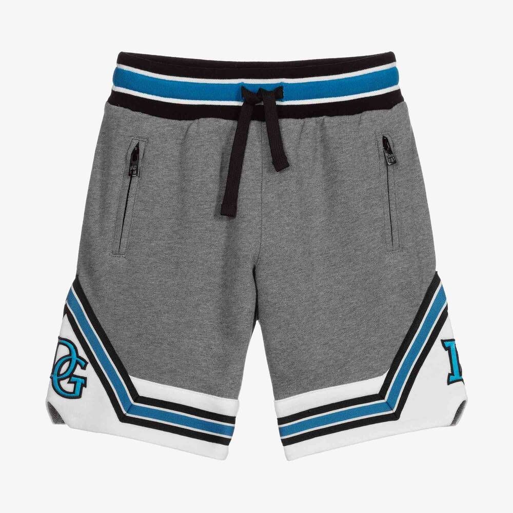 Boys grey shorts from luxury designer Dolce & Gabbana, with white, turquoise blue and black striped trims. They have embroidered logos on the legs and a stretchy drawstring waistband. Made in soft cotton looped back jersey, with zipped front pockets.