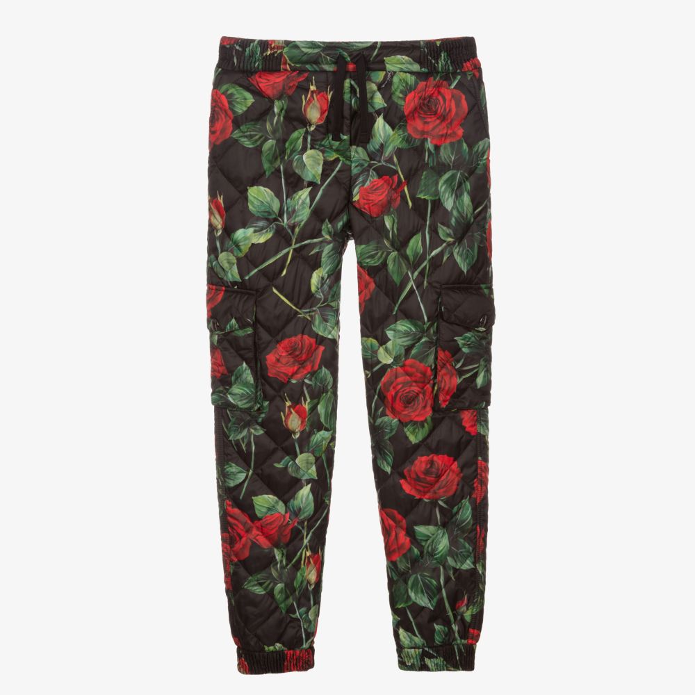 Teen girls black quilted joggers from Dolce & Gabbana, made with silky smooth fabric and padded for warmth. They have an all-over signature roses print in red and green. Fully lined in cotton jersey, these trousers feature elasticated leg cuffs, side slant pockets and popper-fastening side pockets. The waistband is elasticated with a drawstring.