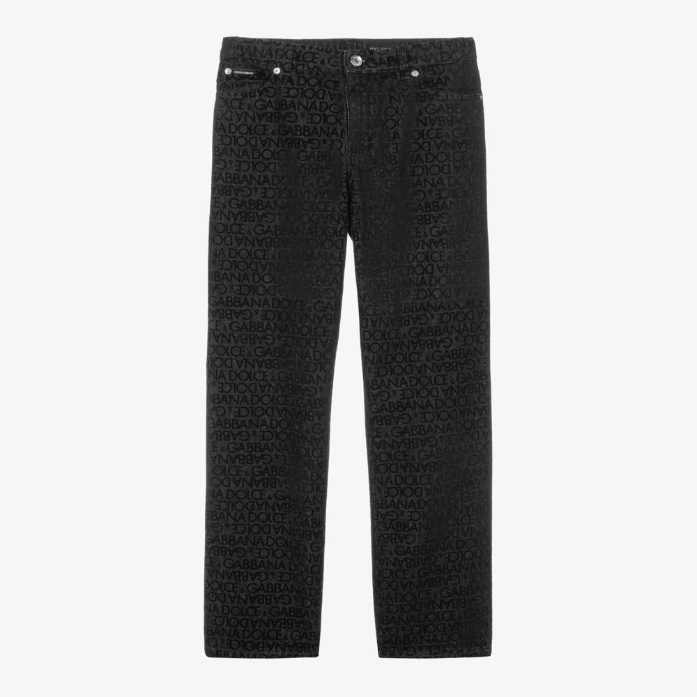 From luxury brand Dolce & Gabbana, these black Mini-me jeans are designed for teen boys. Made in rigid cotton denim, they have a flocked logo pattern for added texture. They feature a zip with button fastening, belt loops and a five pocket design. The signature look is finished with branded silver rivets and metal logo hardware on the back pocket.