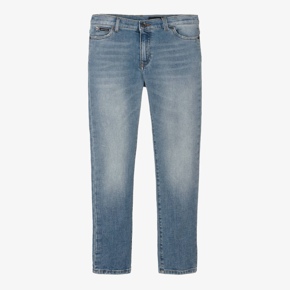 From Dolce & Gabbana, these blue denim jeans for teen boys are a style inspired by the adult collection. These washed-and-worn effect jeans are designed with an off-white D&G logo graphic on the back for that stand-out designer look. Lightly distressed trims on the pockets and hem add to this cool, edgy look. In a classic straight-leg fit, they are made from luxuriously soft, slightly stretchy cotton for endless comfort. They are signed with a branded silver-tone button and rivets, a label on the pocket, and a metal logo plate on the back. With five pockets, they fasten with a front button and zip.