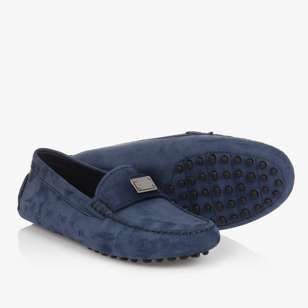 Traditionally styled, navy blue moccasin shoes for teen boys by luxury brand Dolce & Gabbana, made in beautifully soft suede leather. These classic slip-on shoes have a silver metal logo plaque on the front for instant designer impact. They are lined in smooth leather for comfort and are detailed with complementing stitching and signature pebble grips on the soles.
