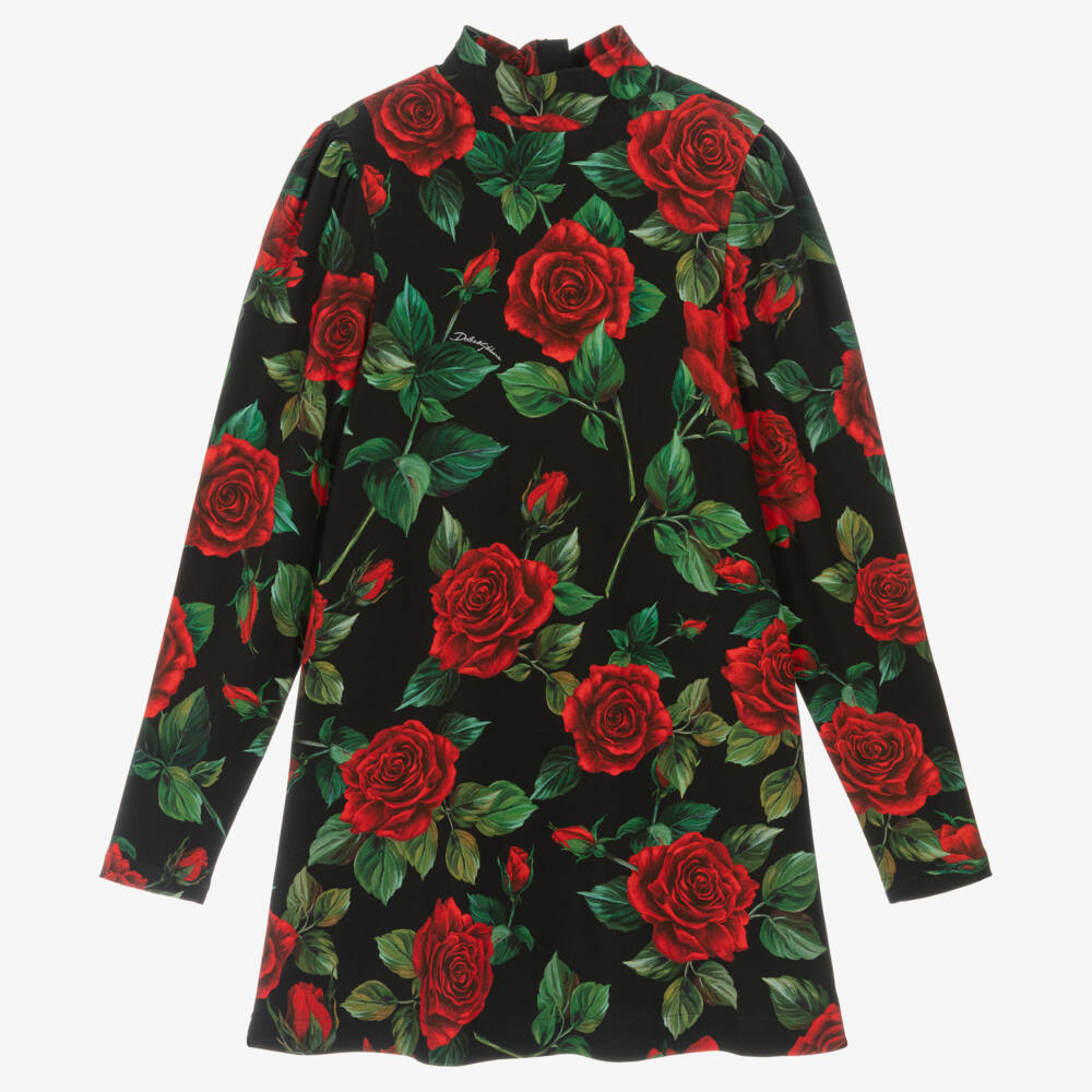 Patterned in a gorgeous red and green rose print, this striking black dress for teen girls is by luxury Italian fashion house Dolce & Gabbana. For a subtle designer touch, the print incorporates the brand's white script logo. In a relaxed A-line shape, the dress has an elegant high neckline and lightly puffed sleeves. Made in comfortable cotton jersey, it fastens with a concealed zip on the back.