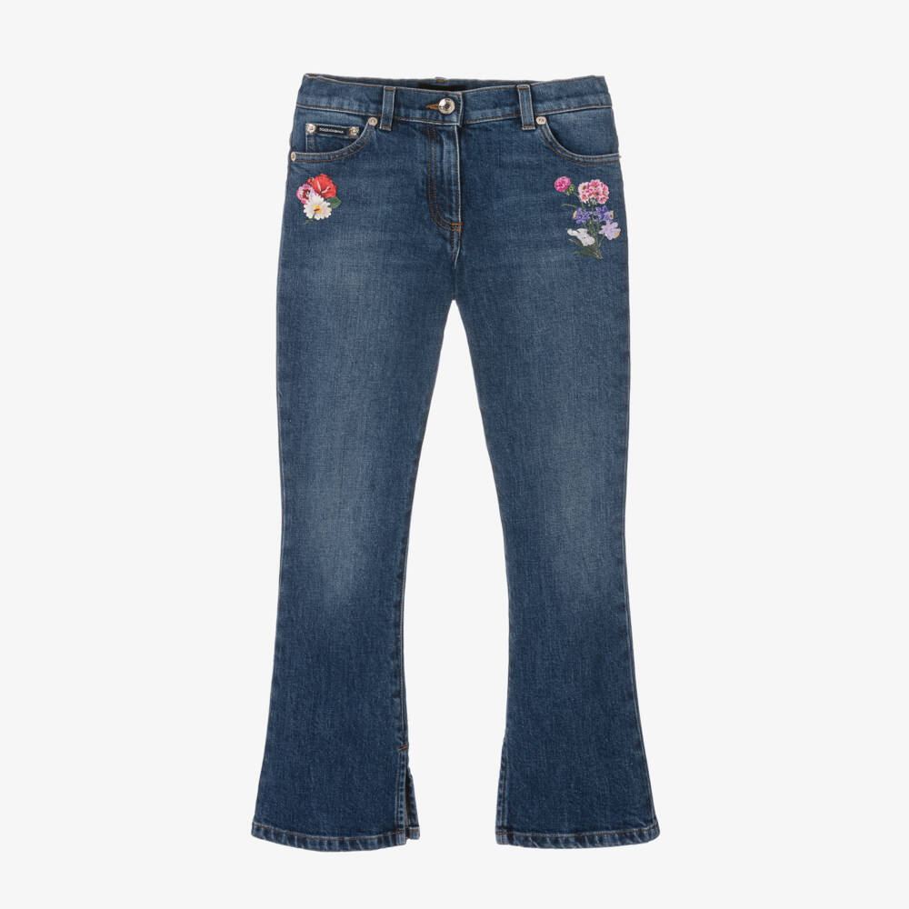 Mid-blue wash denim jeans for teen girls by Italian brand Dolce & Gabbana. They are cut in a flared silhouette with a vented hem for cool retro styling. Intricately embroidered floral appliqués add those touches of luxury to these cotton jeans. Luxuriously soft and slightly stretchy for lasting comfort, they are signed with a branded silver-tone button and rivets, a label on the pocket, and a golden logo plate on the back. With five pockets, they fasten with a front button and zip.