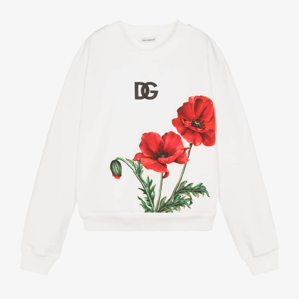 A nature-inspired white sweatshirt for teen girls by luxury Italian designer Dolce & Gabbana, signed with a black crossover DG logo print on the chest. From the brand's Happy Garden collection, this vibrant layer is appliquéd with large red and green poppies for a romantic feel. Cut for a boxy fit, it has dropped shoulders, comfortable ribbed trims and concealed side pockets.