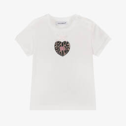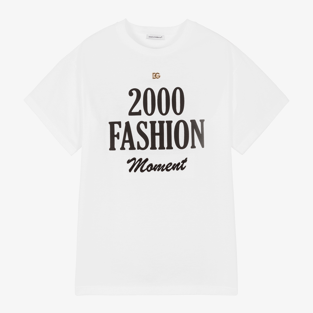 White T-shirt for teen girls by luxury Italian brand Dolce & Gabbana, as seen in the main collection. Made in soft cotton jersey, the front has a gold metal crossover DG logo, with '2000 Fashion Moment' printed and embroidered in black.