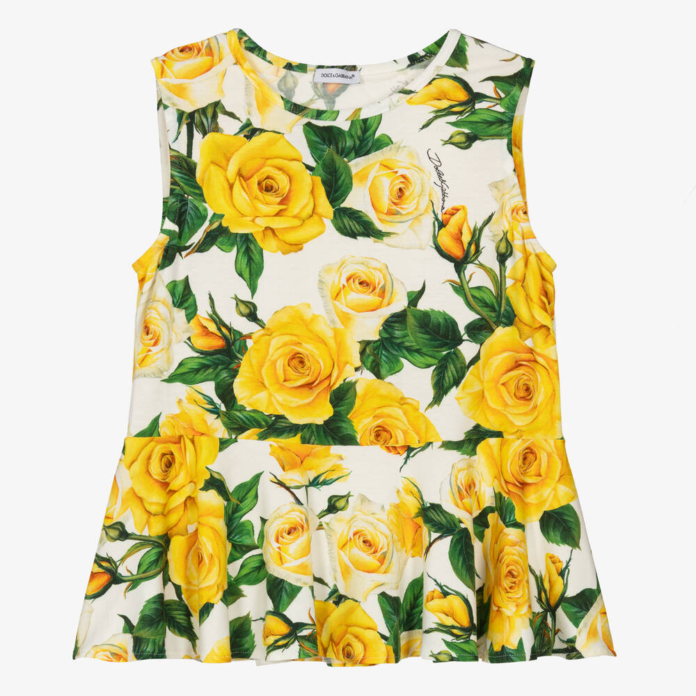 Comfortable and stylish for teen girls, this white sleeveless top from Dolce & Gabbana has a vibrant rose print in yellow and green. Adding a discreet branded touch, the luxury Italian designer's black script logo can be seen on the chest. This vibrant, casual top is made in soft viscose jersey with a pretty, flippy hem.
