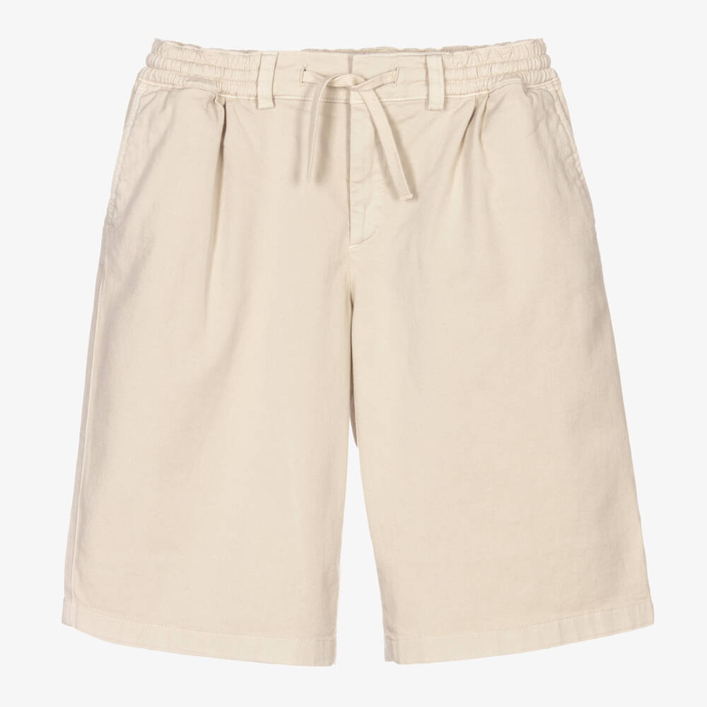 Smart casual ivory cotton shorts for teen boys by luxury brand Dolce & Gabbana, made in soft, mid-weight twill with a slight stretch. Taking inspiration from street style, these oversized shorts have a the designer's embroidered crossover DG logo under one back pocket. They fasten with a drawstring and have four useful pockets.