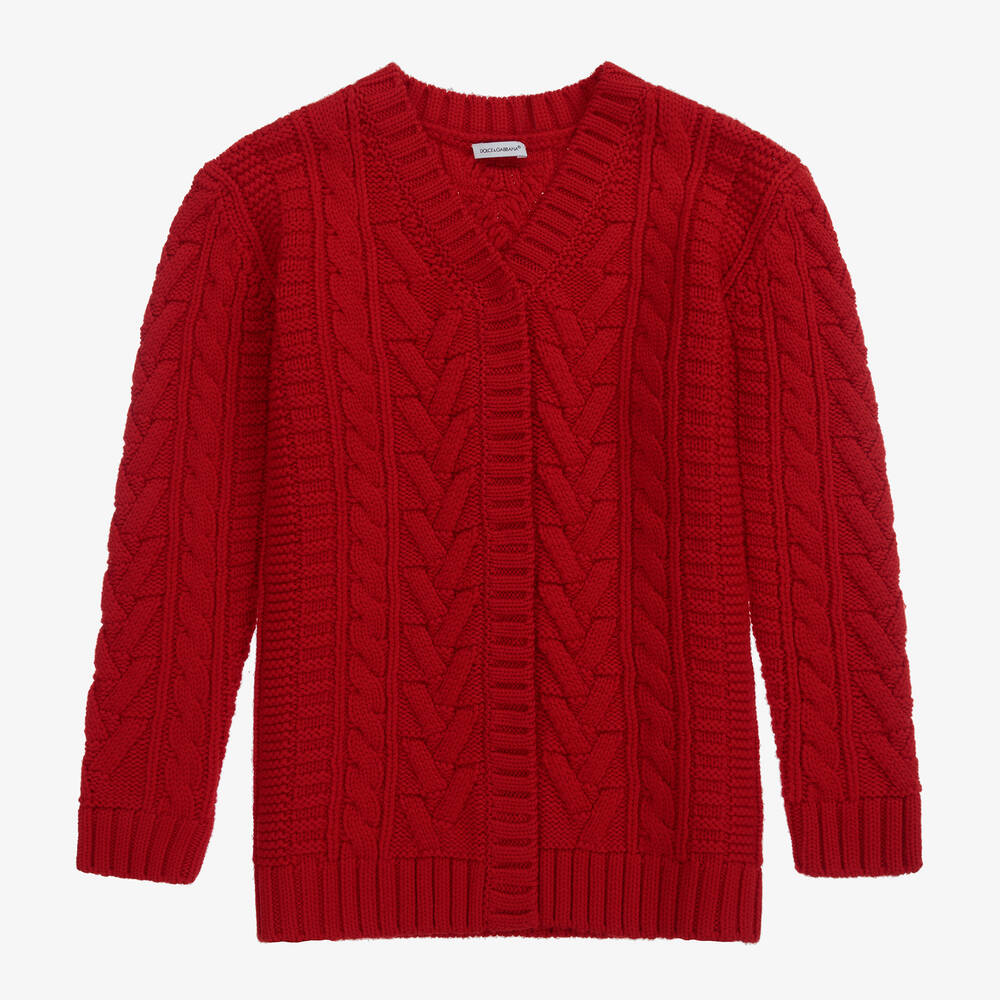 Teen girls red cable knit wool cardigan by luxury brand Dolce & Gabbana. Inspired by the Womenswear runway collection, it is gorgeously soft and warm. It has concealed front popper fastening and a DG logo appliqué embroidered on the back of the neck.