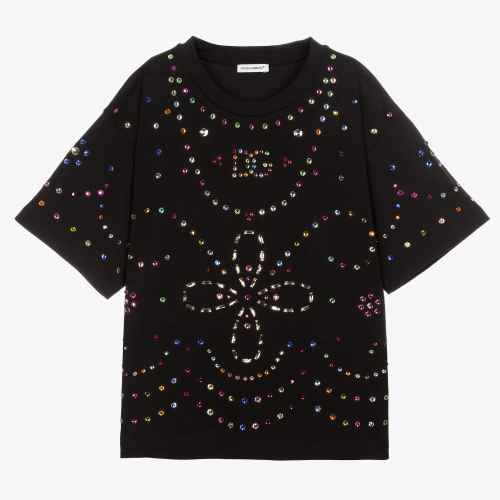 Teen girls black T-shirt by luxury brand, Dolce & Gabbana. Ornately decorated with colourful rhinestones, this eye-catching top has the designer's DG logo embellishment on the front.