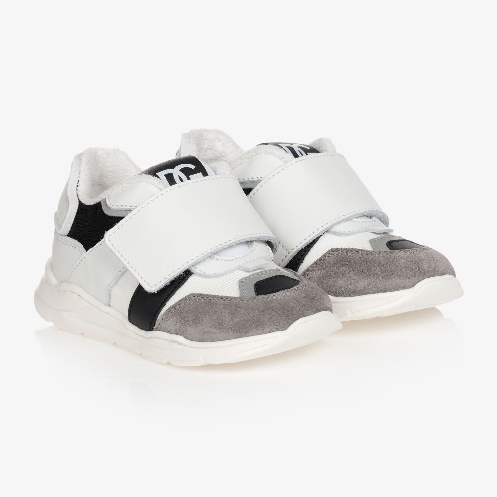 White leather sneakers for younger boys by luxury brand, Dolce & Gabbana. They have grey suede, black leather and silver reflective trims. They fasten with a velcro strap and have logo embroidery at the heels and a logo-branded tongue. They have a towelling lining and a leather inner sole. The soles are moulded and non-slip.
