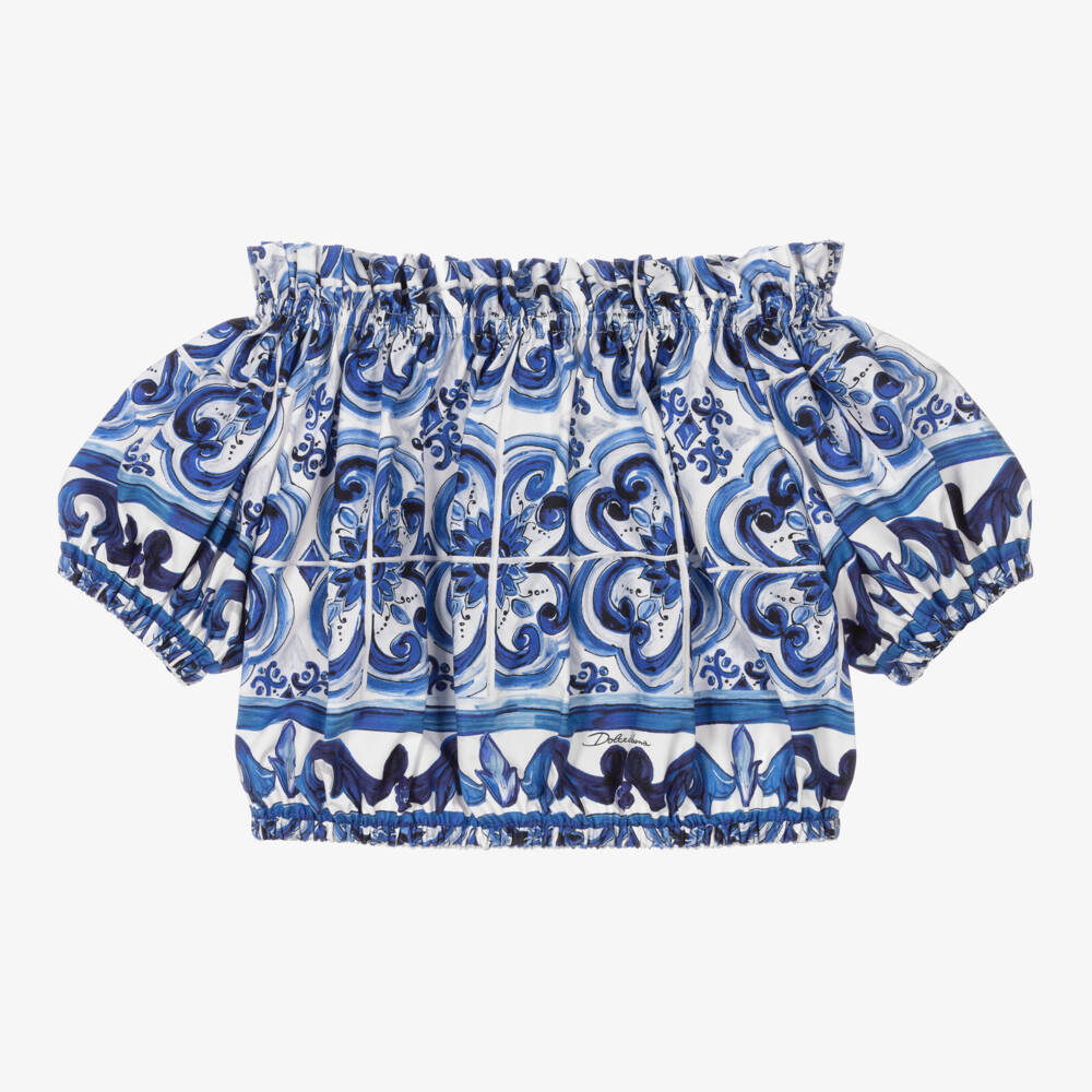 Woven in beautifully soft cotton poplin, white and blue mini-me Majolica top for girls by luxury designer Dolce & Gabbana. With gathered elasticated trims for a stylish look, it is patterned with the brand's intricate Majolica tile print and has gorgeous puffed sleeves for an exaggerated look.