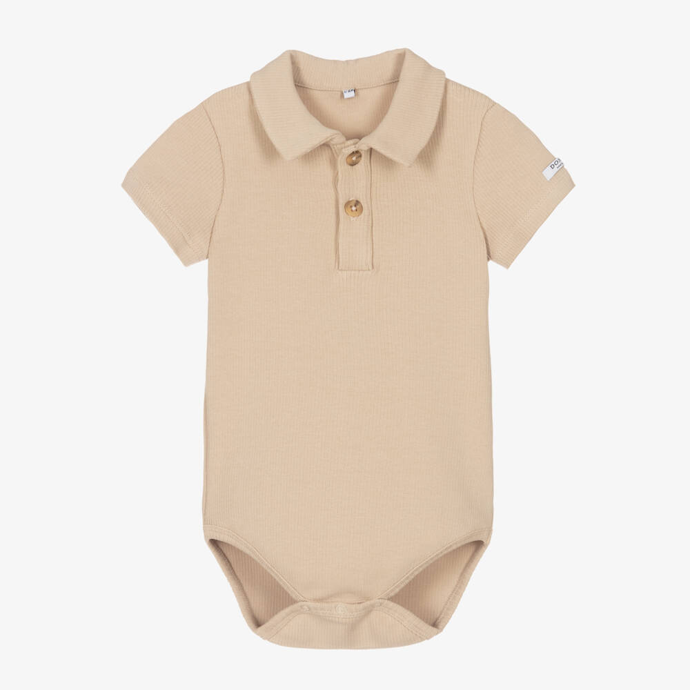 Baby boys beige organic cotton bodysuit by Donsje, with a small pointed collar and brown button fastenings. Handcrafted in soft, ribbed jersey, this comfortable babysuit has short sleeves, with a small branded tab on one sleeve. Ideal for layering, the bodysuit has popper fastenings underneath, ideal for changing little ones.