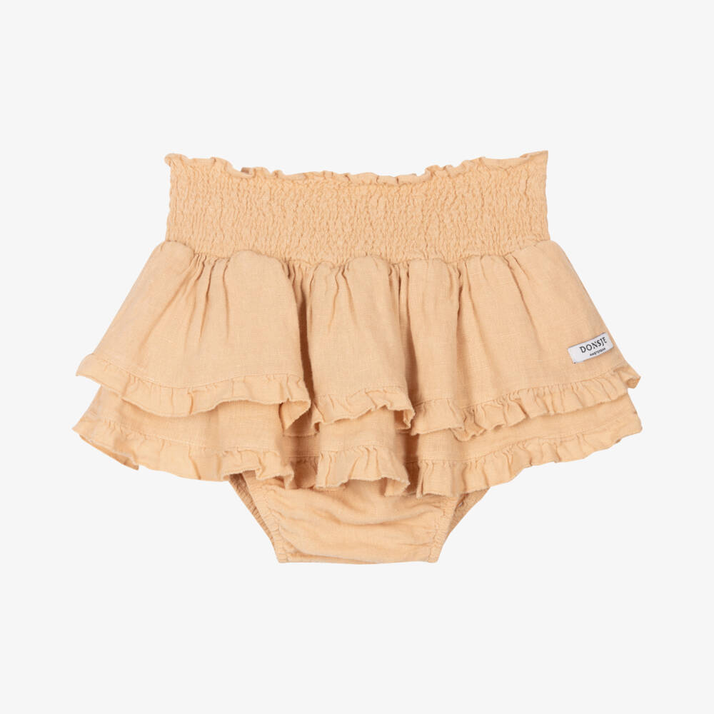 So sweet for baby girls, a pastel orange skirt by Dutch brand Donsje, handmade in lightweight linen. It has a deep shirred waistband for comfortable wear and pretty tiered layers with ruffled trim. It comes with attached bloomers and has an embroidered logo tab on the front to complete the look.