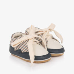 Cute ivory and brown leather pre-walker boots for baby boys and girls from Dutch brand Donsje. Designed as a cute Dalmatian dog with spotty fur, they have embroidered facial features on the front and sweet appliqué ears. They are lined in soft faux fur for comfort and warmth and have a velcro strap fastening on one side for a secure fit. The smaller sizes have a soft, suede leather sole, whilst the larger sizes have a flexible rubber sole, idea for taking those first steps.