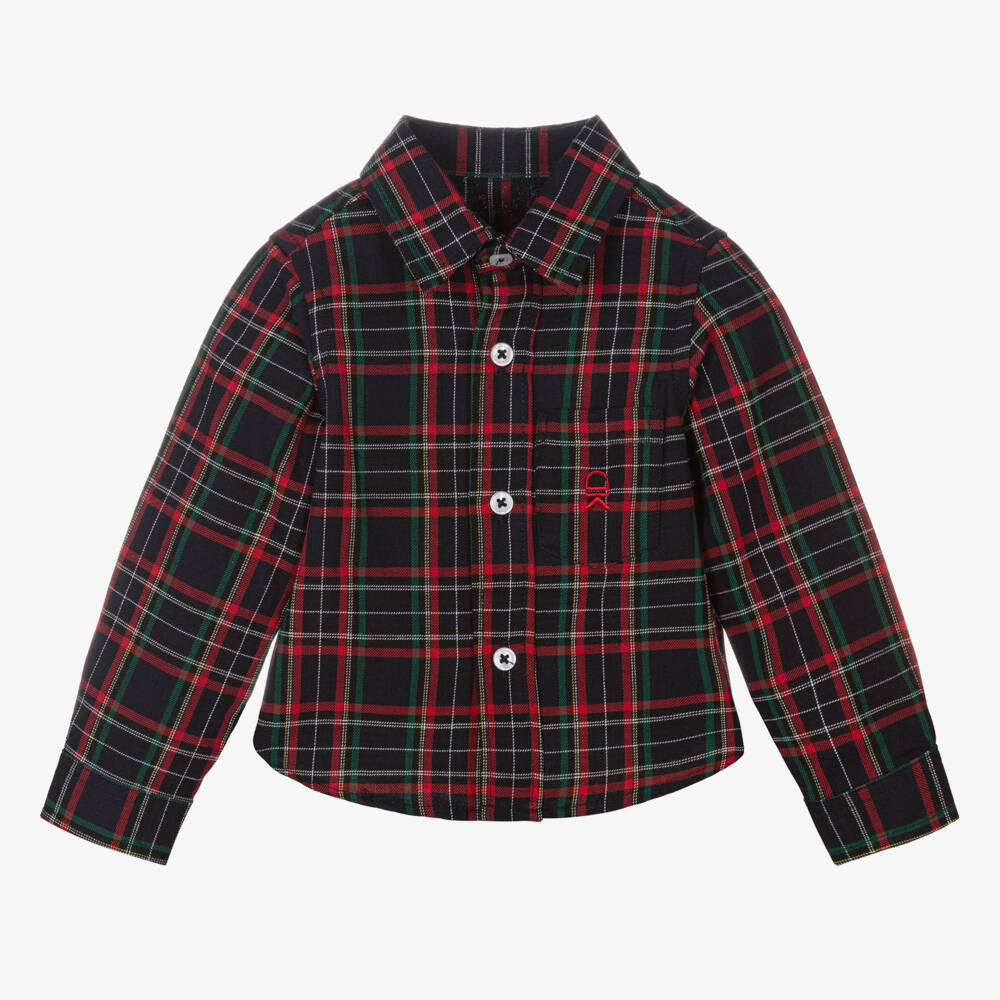 Navy blue check cotton shirt for boys by Portuguese brand Dr. Kid. Made in a lightweight twill, it is checked with tones of red and green and has a smart pointed collar. It has button fastenings at the front and on the cuffs and there is an embroidered logo on the chest pocket for an extra branded touch.