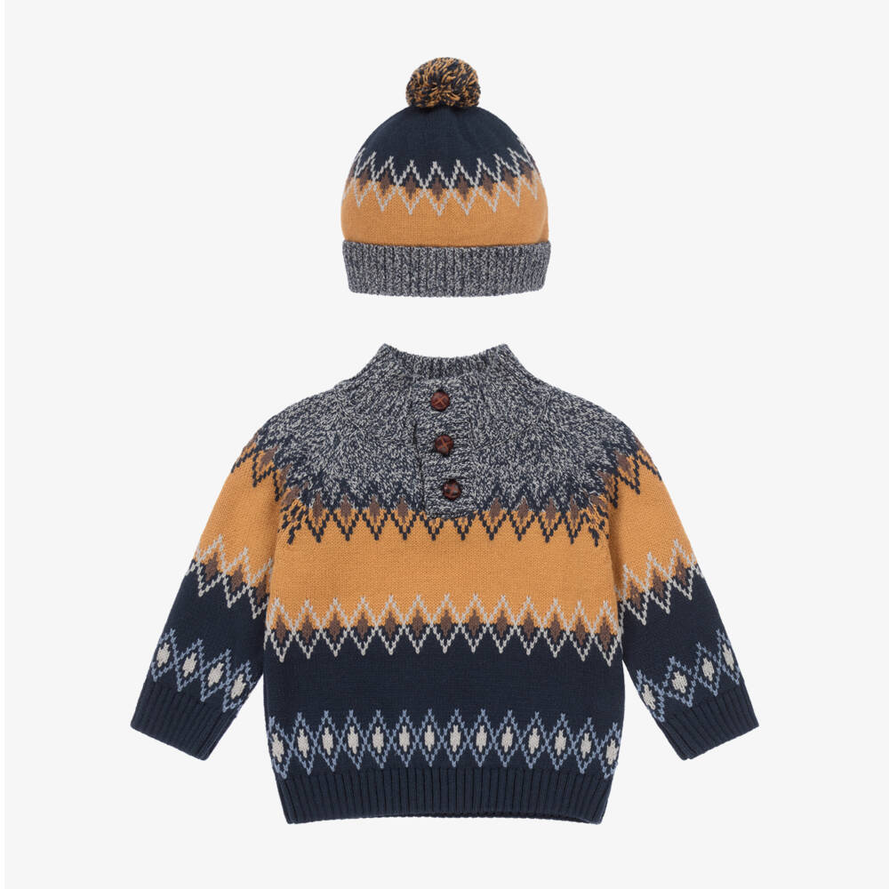 Navy blue and mustard yellow sweater for little boys by Portuguese brand Dr. Kid, knitted in a soft cotton blend. This cosy patterned sweater has gently ribbed trims and fastens at the front with decorative wood effect buttons. It comes with a matching hat with a cute bobble on the top.