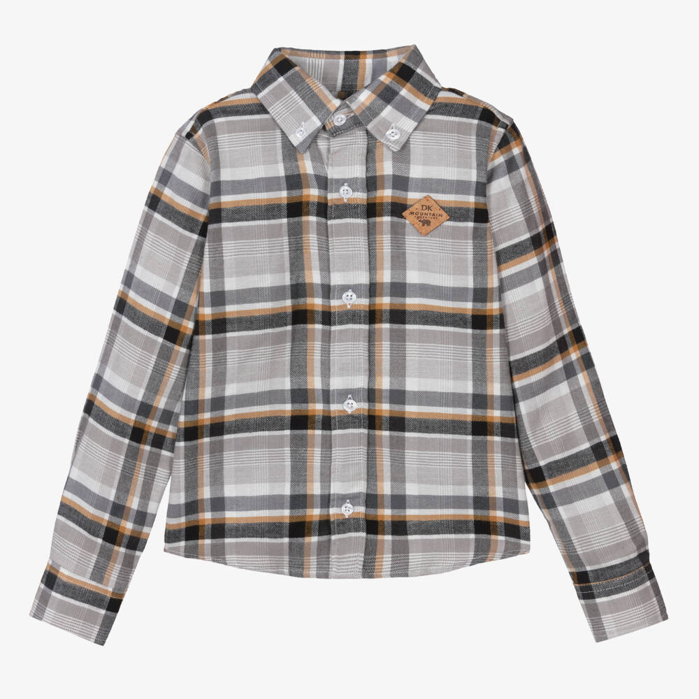 Grey check shirt for boys by Portuguese brand Dr. Kid. Made in soft brushed cotton blend, it has tones of mustard yellow and a smart button-down collar. It has button fastenings at the front and on the cuffs and there is a logo patch on the chest for an extra branded touch.