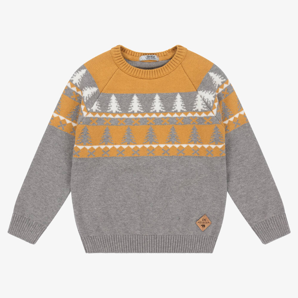 Mustard yellow and grey cotton blend sweater for boys by Portuguese brand Dr. Kid. Made in a soft knit, this cosy sweater has a lovely Fair Isle pattern, a crew neck and gently ribbed trims. It has a logo patch sewn just above the hem for an extra branded touch.
