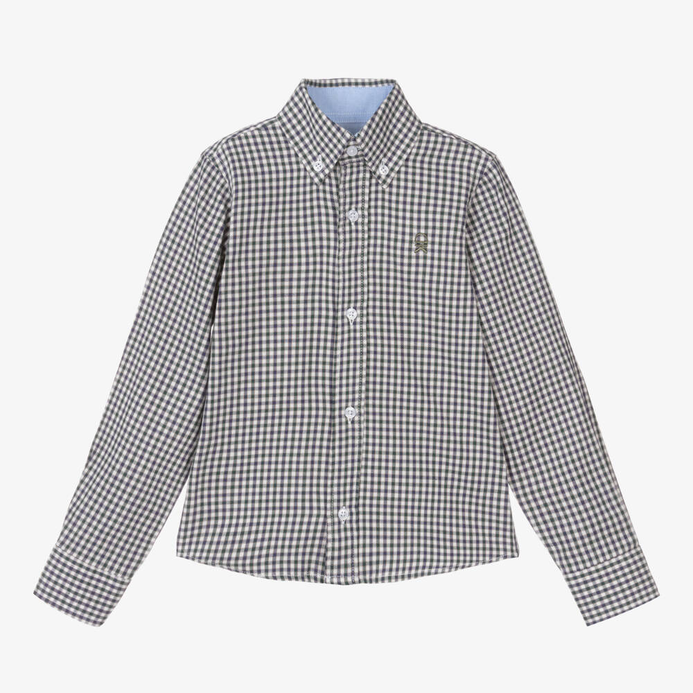 A casual cotton shirt for boys by Dr. Kid, in a white, green and blue check design. A green logo is embroidered on the chest, with button fastenings on the front, neatly keeping the collar in place.
