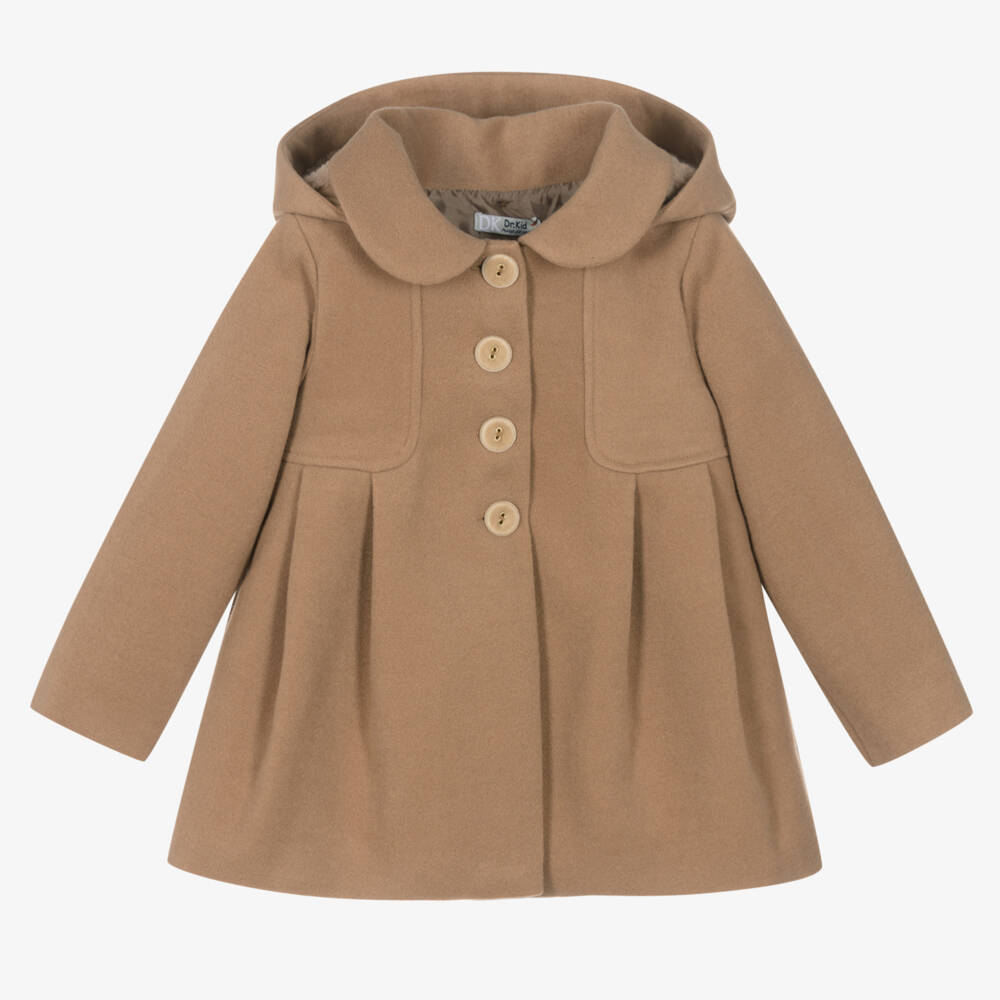 Lovely beige coat for girls by Dr. Kid, made in a soft felted fabric with a brushed wool feel. Traditionally styled, it has smart velvet covered button fastenings, a sweet bow on the back and soft pleats for a flared shape. The removable hood has a super soft faux fur lining and attaches with buttons under the collar.