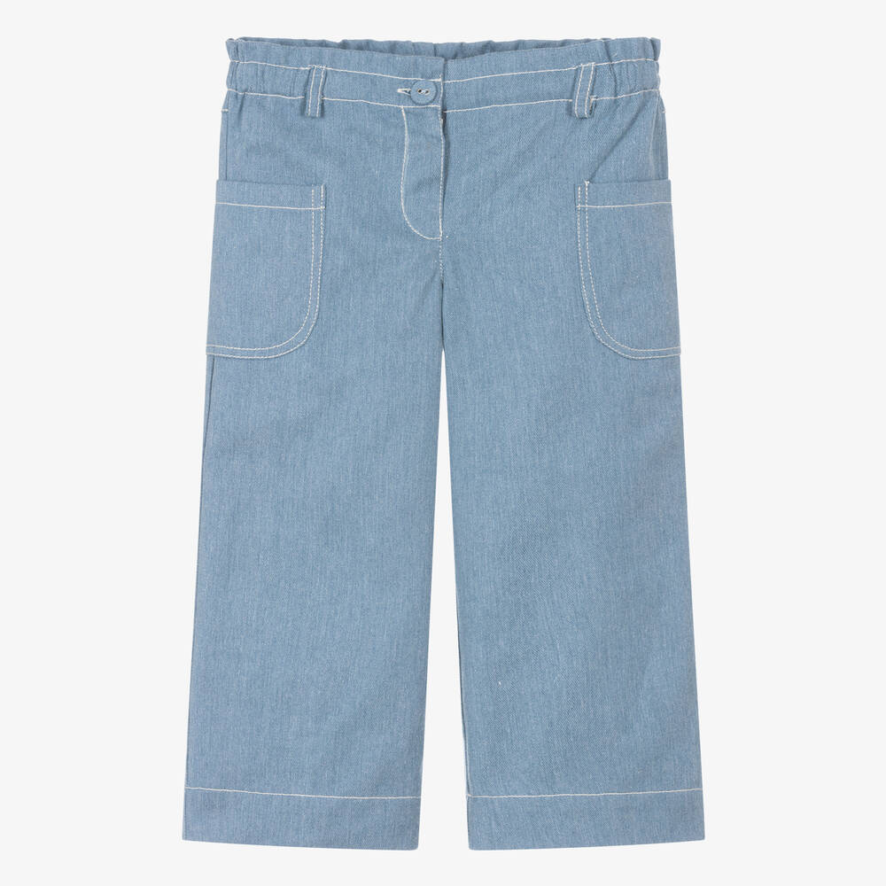 Blue cotton-blend trousers for girls by Dr. Kid, with large patch pockets on the sides. They are made in soft, lightweight denim and have wide legs and white overstitching. They fasten with a button and zip on the front and have a paperbag waistband that is elasticated and adjustable for a good fit.