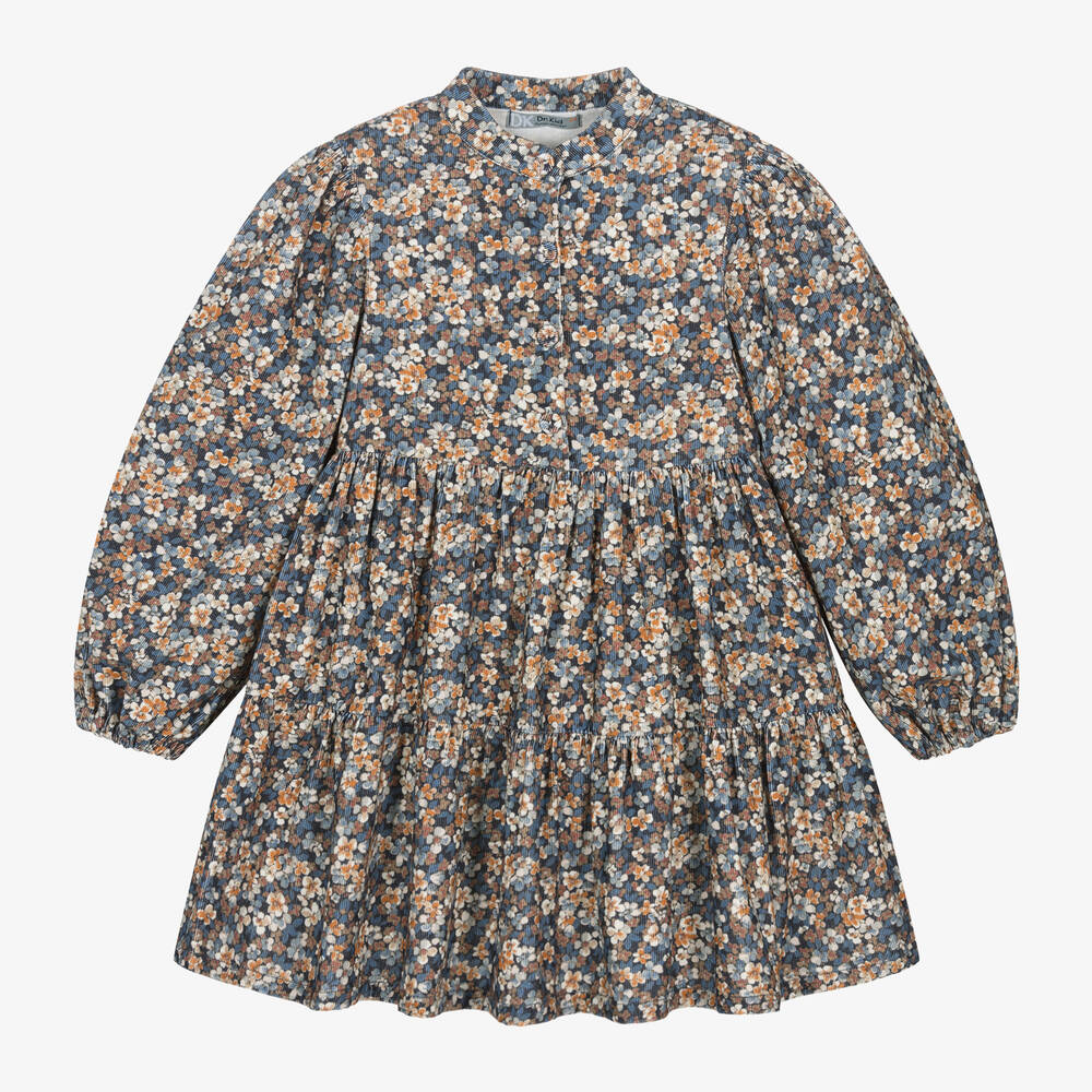 Navy blue and orange floral dress for girls by Dr. Kid, made in soft cotton needlecord. Simply styled with puffed, long sleeves and a gathered, tiered skirt, this pretty dress fastens with fabric-covered buttons on the chest and has an understated, collarless design.
