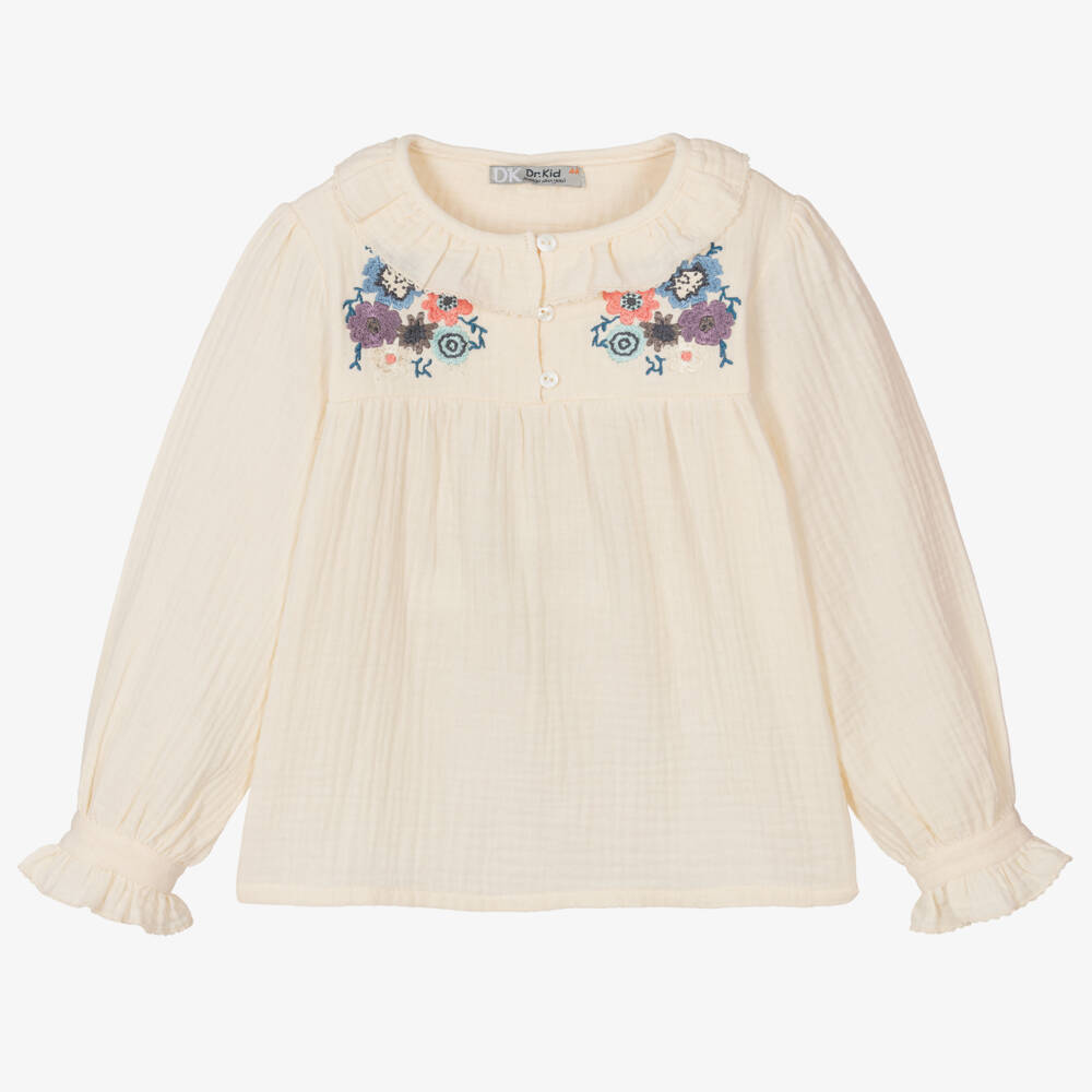 Sweet ivory organic cotton blouse for girls by Dr. Kid, made in a lightweight cheesecloth. This flowy blouse has floral embroidery on the front, a rounded collar and ruffled trims, complete with delicate picot detailing, for a sweet, feminine finish. It fastens with pearlescent buttons on the front.