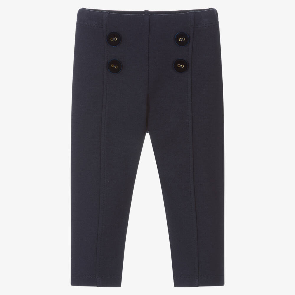 Navy blue leggings for little girls by Portuguese brand Dr. Kid. Made in soft and stretchy jersey, they have stylish stitched seams on the front and decorative velvet buttons. Comfortable and easy to wear, they have a gently elasticated waistband.