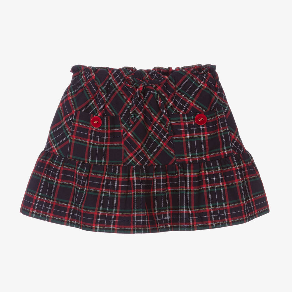Navy blue and red tartan skirt for girls by Dr. Kid. This preppy skirt has a sweet ruffled hem, a faux drawstring tie, and two pouch pockets, decorated with velveteen covered buttons. Made and lined in a lightweight cotton, it has a gently elasticated waistband for a comfortable fit.