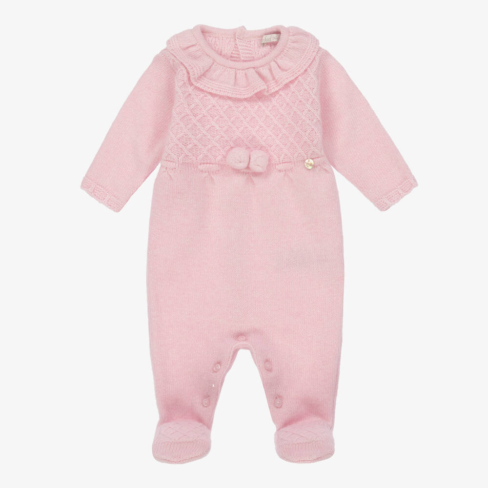 Pretty pink babygrow for girls by Dr. Kid, knitted in a luxuriously soft wool and cotton blend. This cute one piece has a diamond style knit on the chest with two sweet pom-poms. It has a ruffle trimmed collar, and iridescent logo charm sewn on the waist for a discreet, branded detail. It fastens with buttons on the back and between the legs.