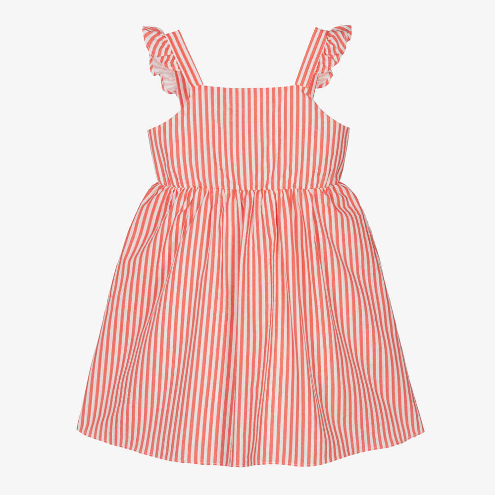 Red and white striped dress for little girls by Dr. Kid, woven in soft and lightly textured cotton. Lovely for the warmer weather, this sleeveless dress has cute frills on the shoulders and popper straps on the back concealed with a pretty bow. The open back is gently elasticated and the full cotton lining ensures a comfortable feel against delicate skin.