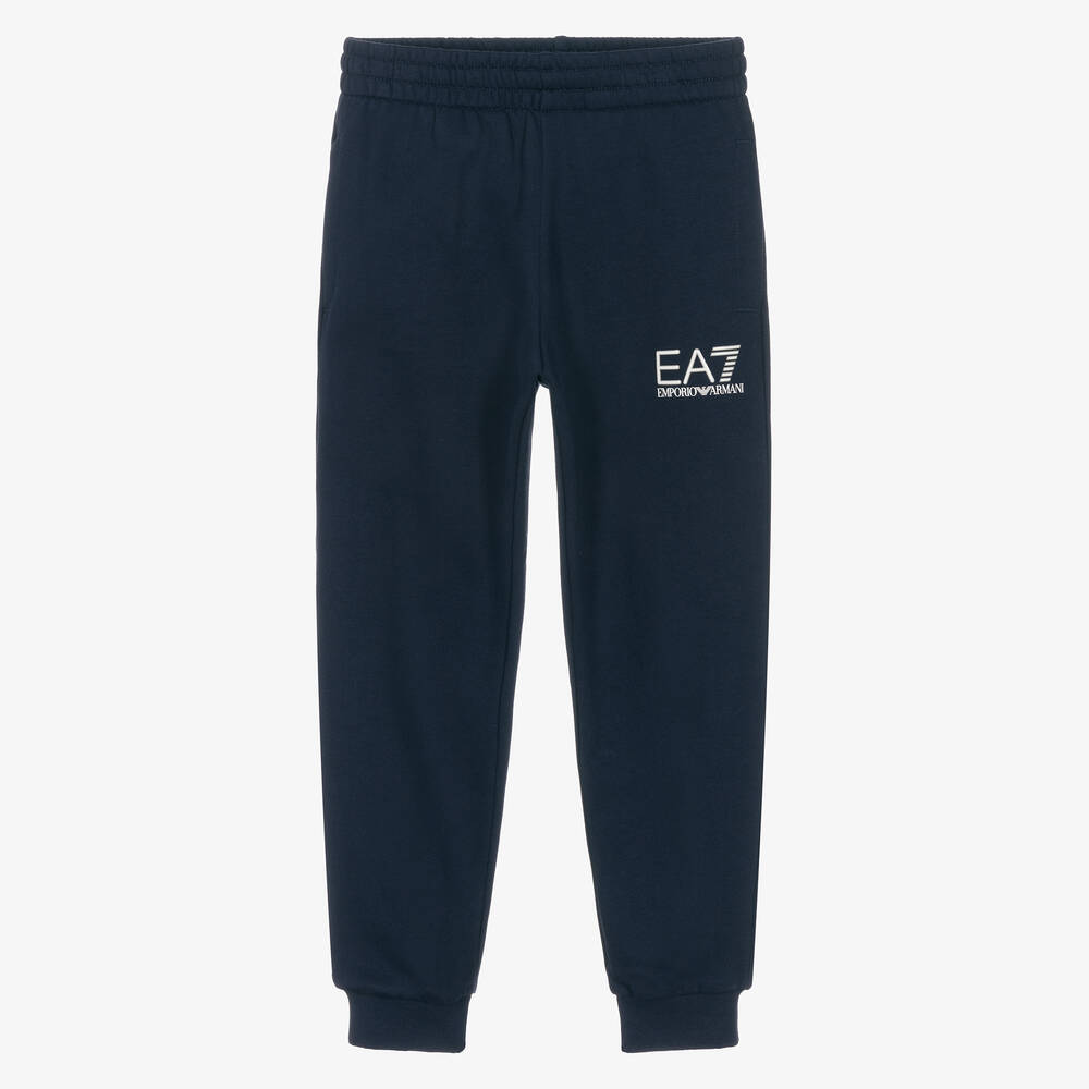 Navy blue joggers for boys by EA7 Emporio Armani, with a rubberised white logo printed on the front. This comfortable, casual style is made in lightweight cotton jersey with a warm, fleecy inside. They have useful concealed side pockets and an internal drawstring waistband for a good fit.