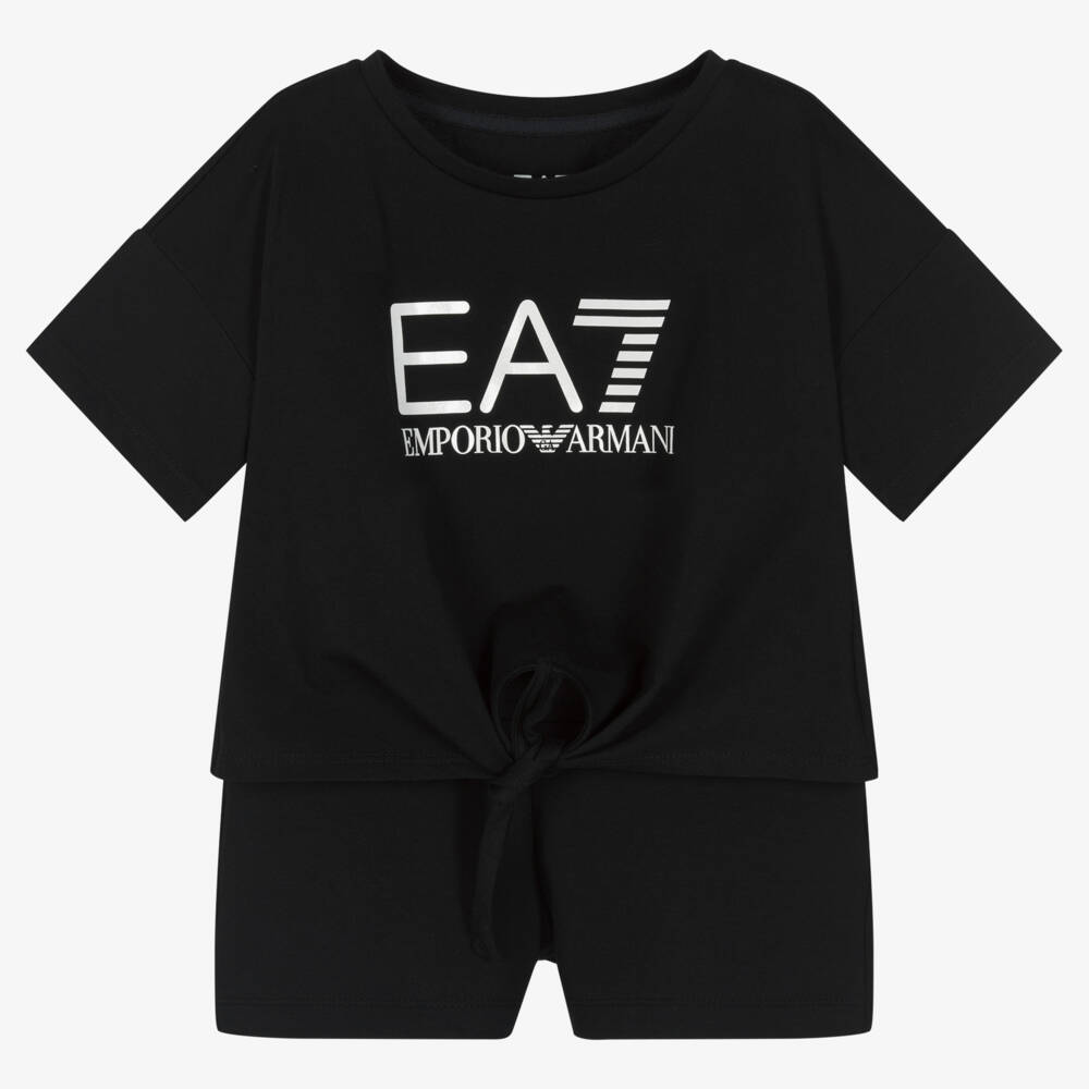 Casual and comfy for girls, this black shorts set is by EA7 Emporio Armani. The relaxed fit T-shirt has a white EA7 logo printed on the front, with a knotted tie at the waist. The pull-on shorts have an elasticated waistband and a matching logo print on the back pocket. Easy-wearing, both pieces are made in soft and stretchy cotton jersey.
