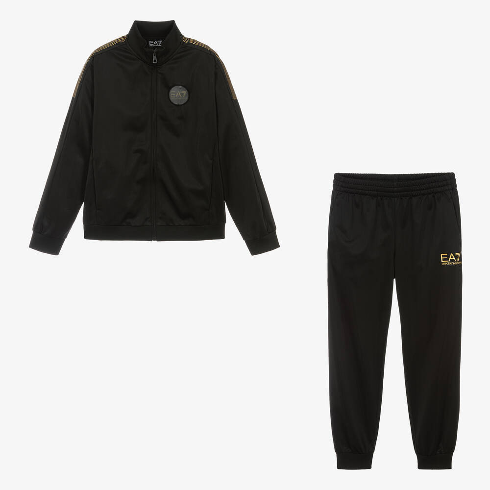 In a cool retro styling, this black tracksuit for boys is from EA7 Emporio Armani. There is a fun, lenticular EA7 patch and a shiny gold print for a logo-inspired sporty look. The zip-up top has a high neck and long sleeves. The joggers are elasticated at the waistband, with an inner drawstring and cuffed legs. Made in smooth jersey with a soft sheen, the coordinating pieces have bold gold striped accents, ribbed trims and concealed slip pockets on the seams.