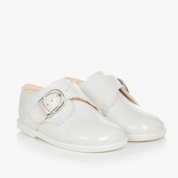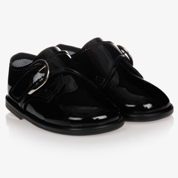 Shiny black first-walker shoes for little boys by Early Days, made in soft patent faux leather. They have an absorbent lining, padded insoles and a flexible sole.