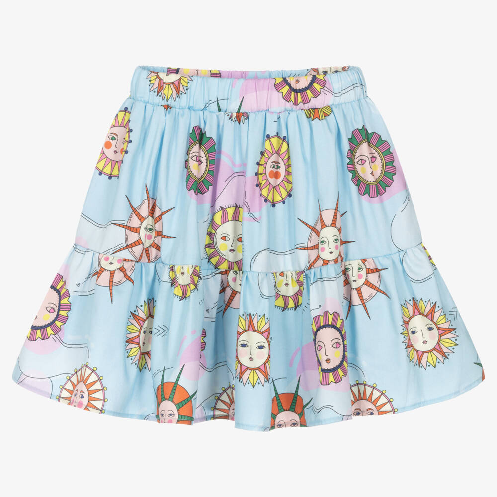 A light blue tiered skirt for girls by Eirene, made in soft and lightweight cotton. It has a sun pattern all-over in pastel hues, for a fun and free-spirited style. The elasticated band ensures that the skirt sits beautifully on the waist.