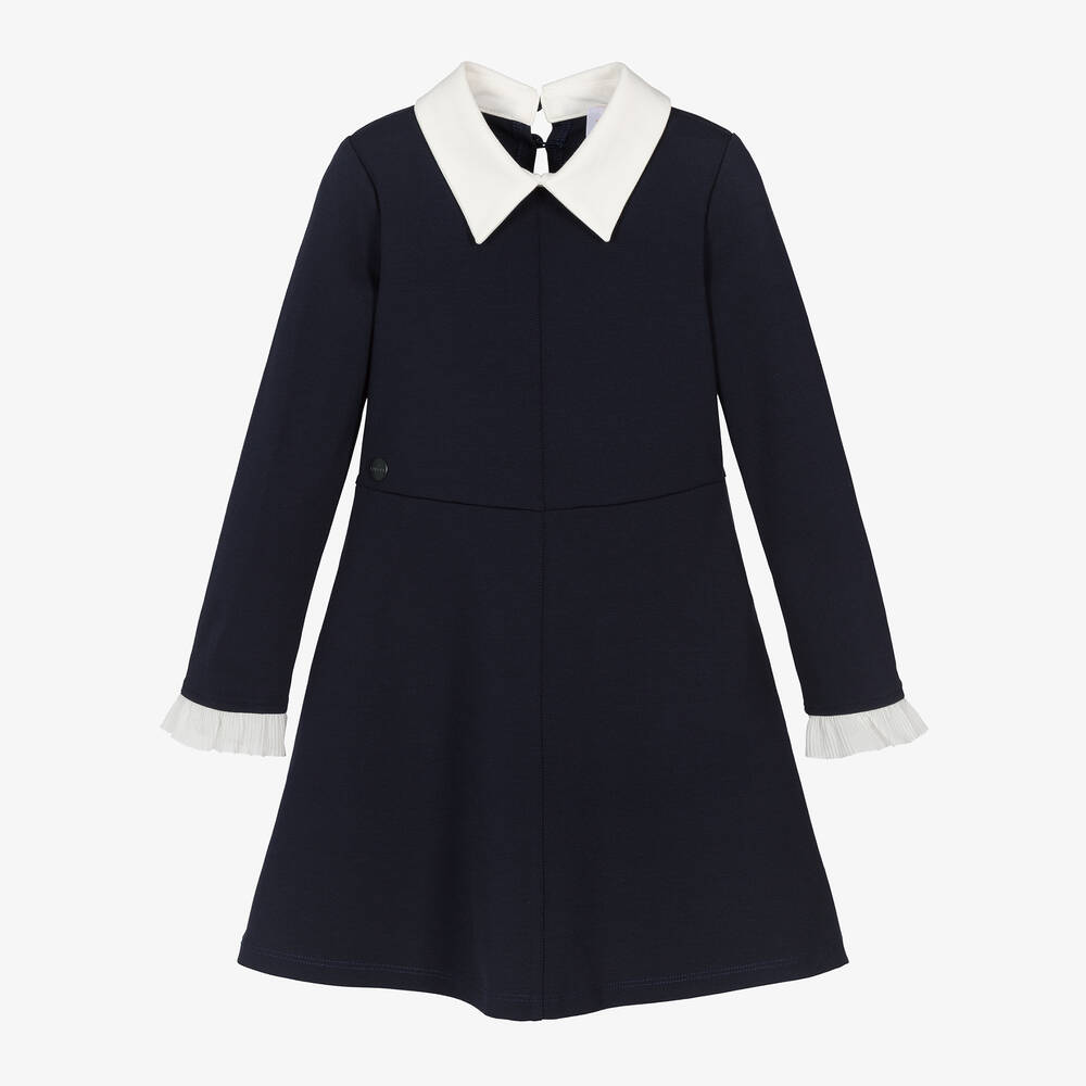 A smart navy blue dress for girls by EIRENE, made in soft viscose blend jersey. Designed with a lovely flared skirt, this long-sleeved dress has a contrasting white pointed collar and pleated frilled cuffs for a classic look. A tonal logo charm sits on the waist and for a neat finish, it fastens on the back with fabric-covered buttons.